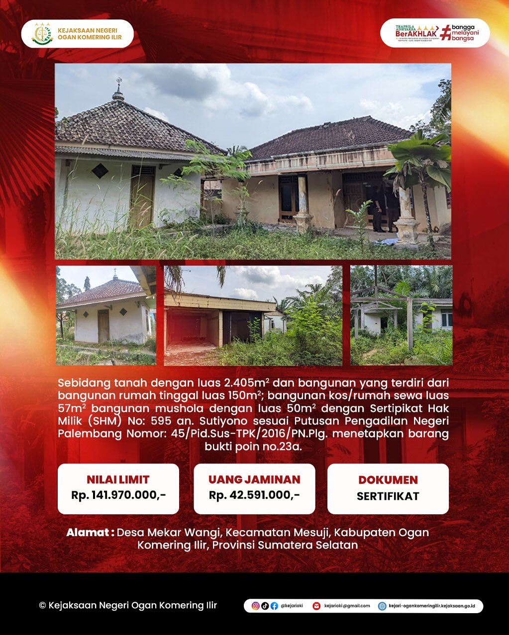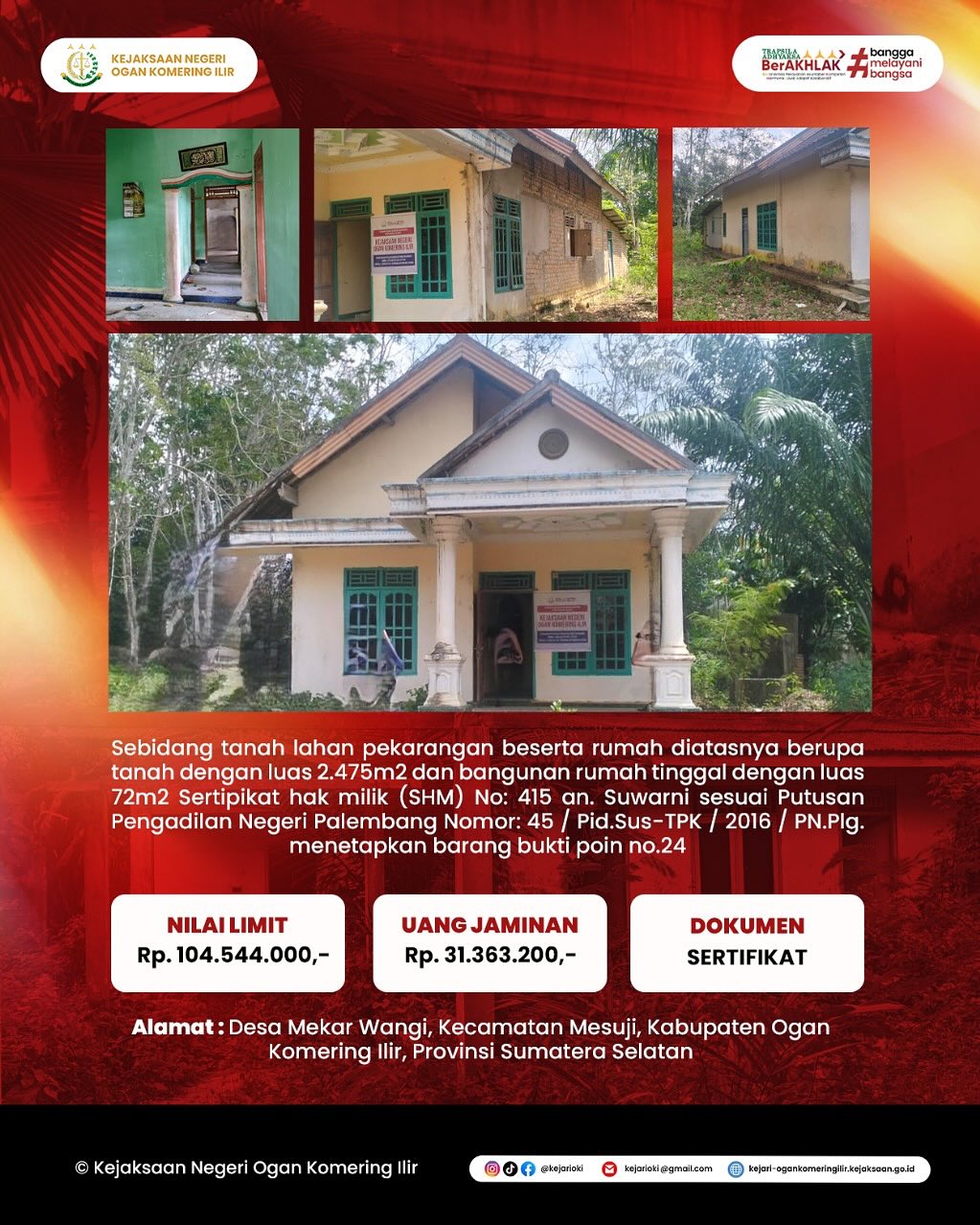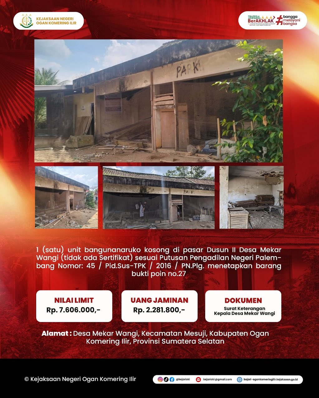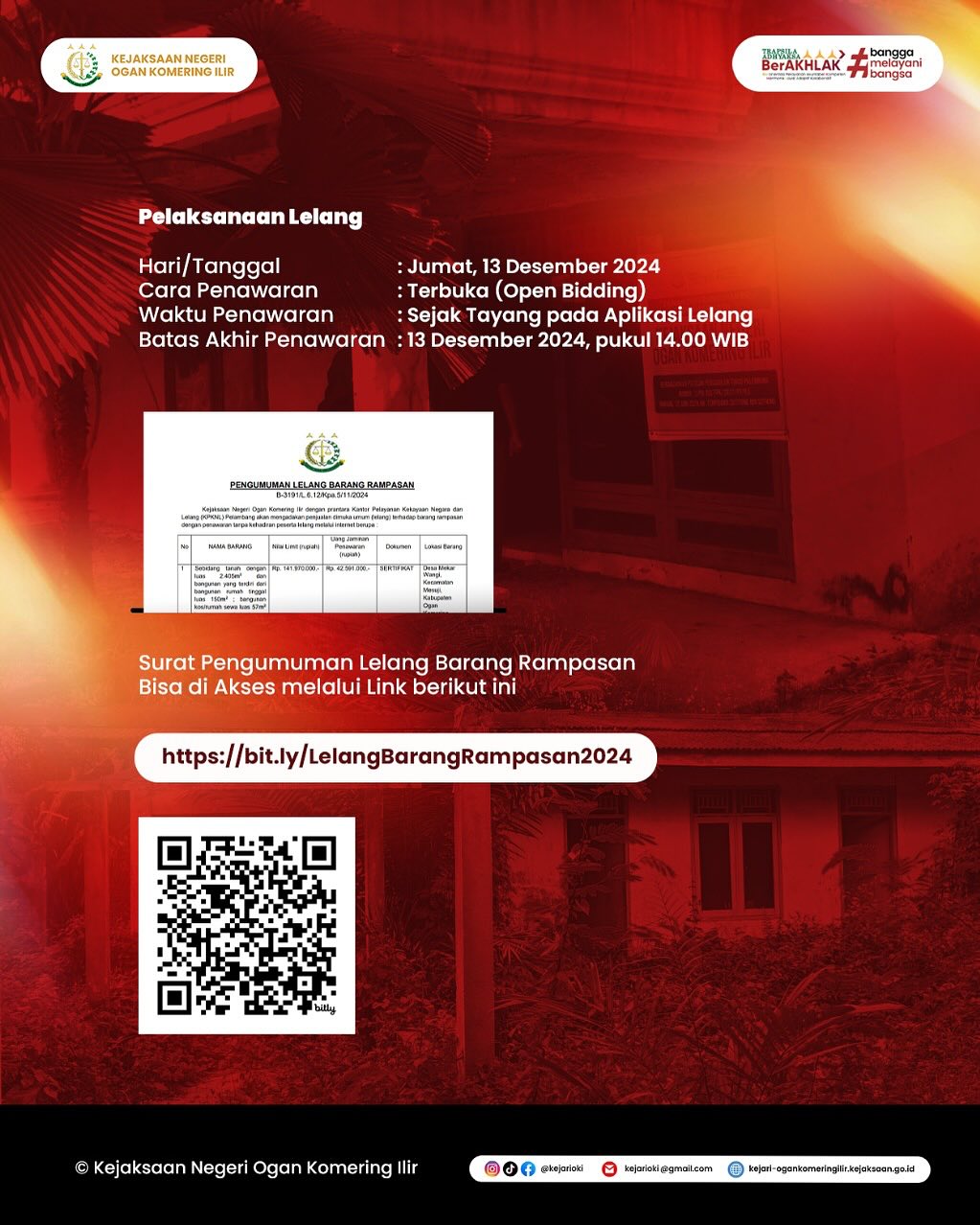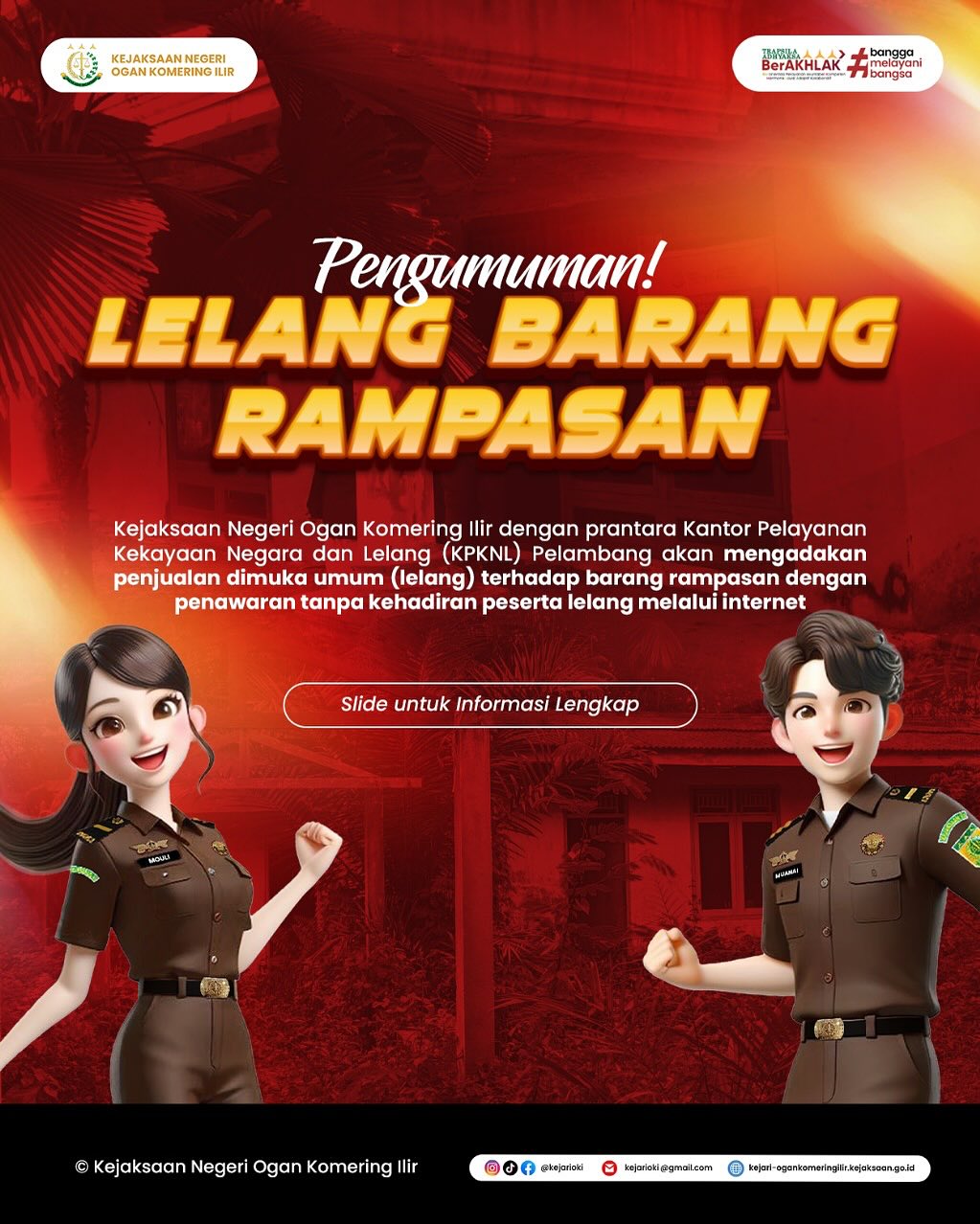 Kejaksaan Negeri Ogan Komering Ilir dengan prantara Kantor Pelayanan Kekayaan Negara dan Lelang (KPKNL) Palembang akan mengadakan penjualan dimukak umum (Lelang) terhadap Barang Rampasan dengan Penawaran tanpa kehadiran peserta lelang melalui Internet